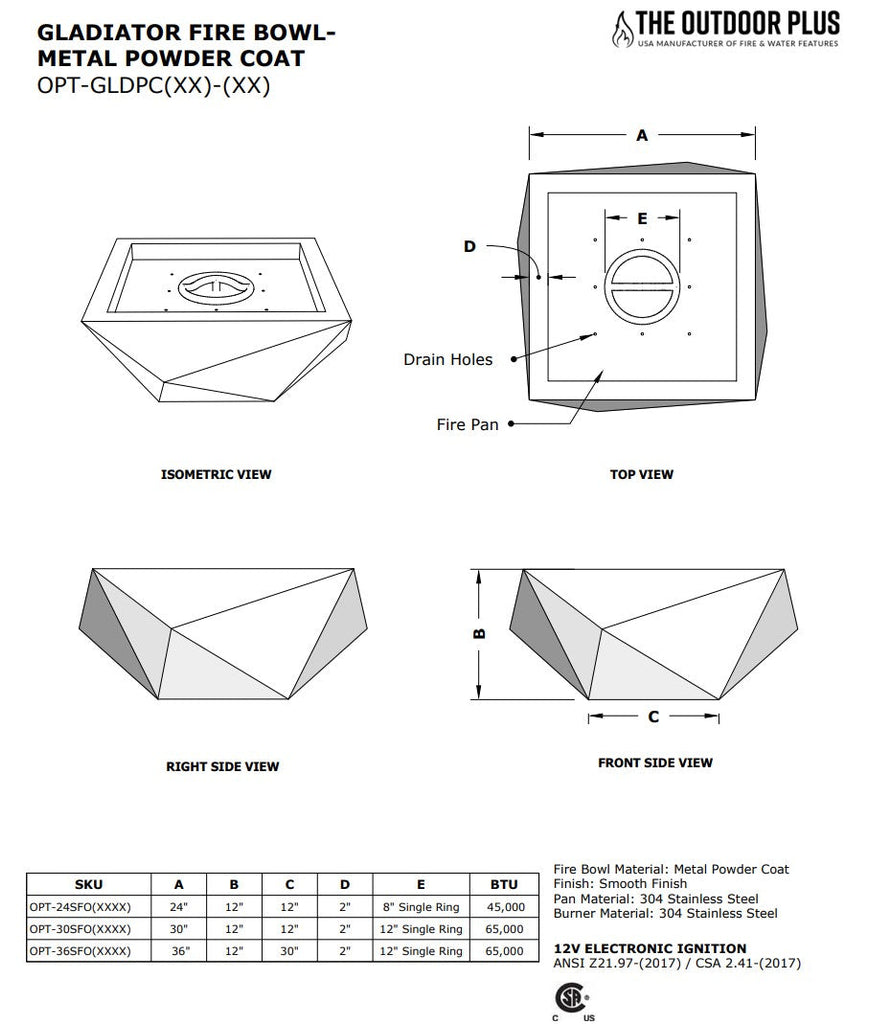 - 30”: Overall Diameter: 30", Overall Height: 12", Base Diameter: 12", Burner Diameter: 12”.