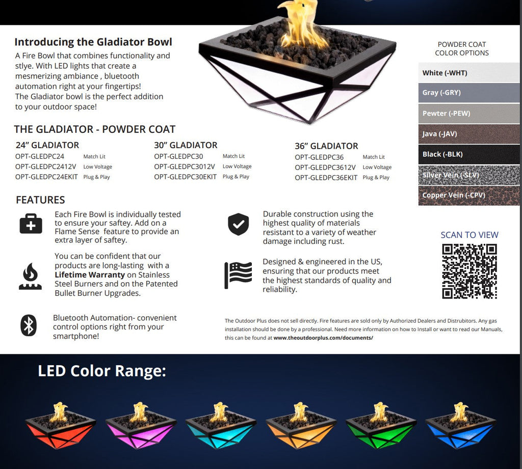 A Fire Bowl that combines functionality and stlye. With LED lights that create a mesmerizing ambiance , bluetooth automation right at your fingertips! The Gladiator bowl is the perfect addition to your outdoor space!