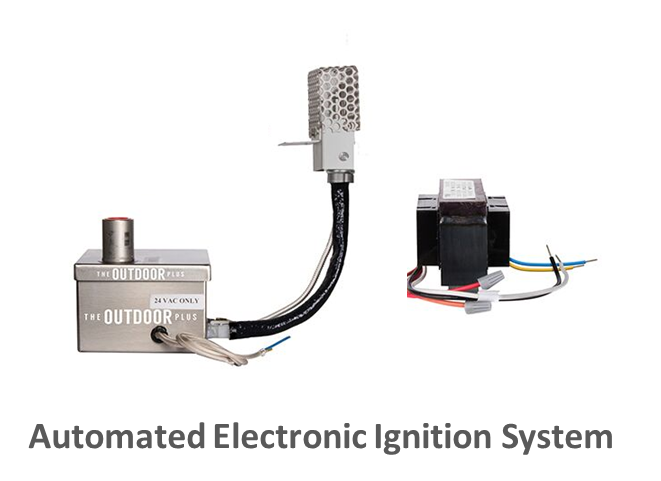 - Automated Electronic: Light the Fire Pit with the flick of a switch placed nearby. Will stay lit in the rain and winds up to 55 mph, and if it blows out, it will re-ignite automatically. Includes 24V Transformer and Electronic Ignition System.