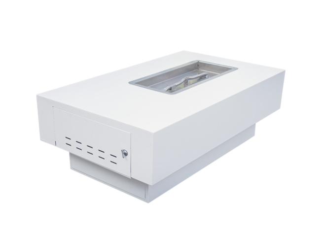 The Outdoor Plus San Juan Metal Fire Pit - Low Profile is a rectangular fire pit with a recessed base, specifically designed for Propane (but also availabe for Natural Gas) that features a sliding loader for a horizontal tank, which results in a low, 18 inch profile, perfect to lounge around for drinks with friends.
