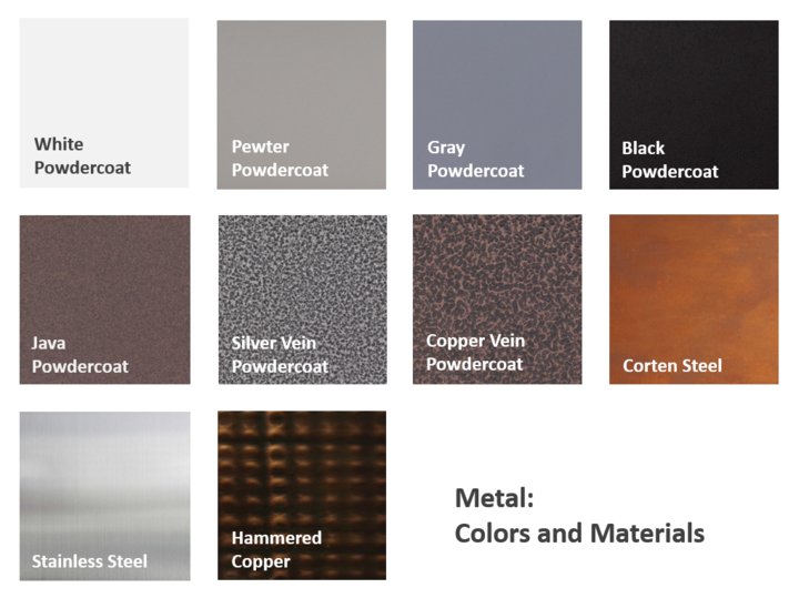 - Material: Corten Steel, Stainless Steel, Powdercoated Steel (4 Colors) or Hammered Copper. The Powdercoat finish has a slight texture. Copper will change its color into a blue/green hue over time due to its natural properties and surrounding environment. Read: What is Corten Steel?